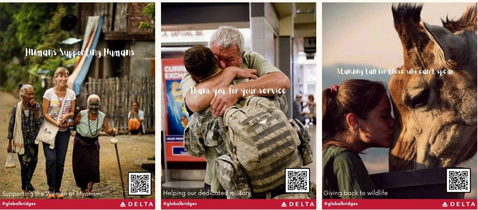 Throughout this campaign, we want these advertisements to go around Delta Hub cities with three special causes that Delta will donate to. Each poster will have a QR code that will go directly to a donation page where each dollar=one Skymile.